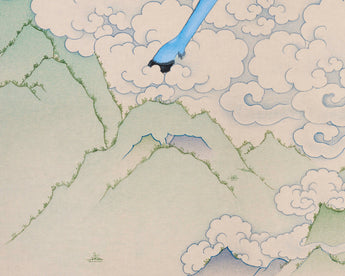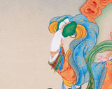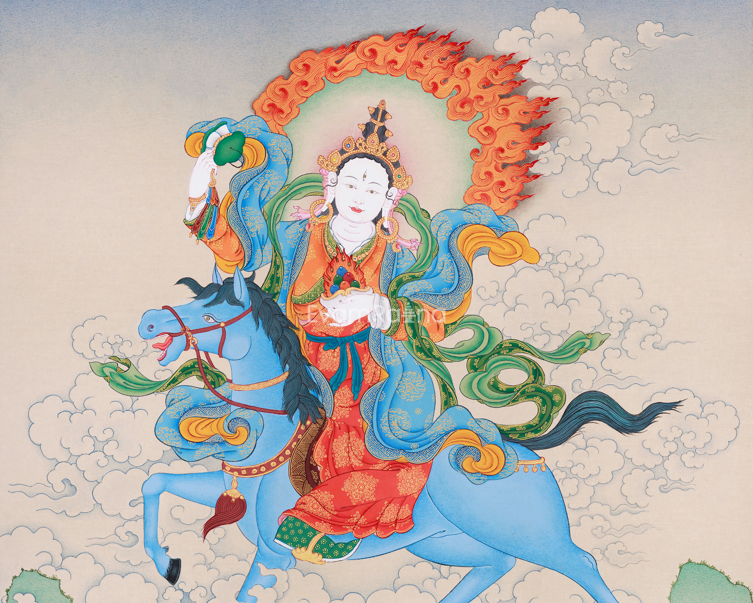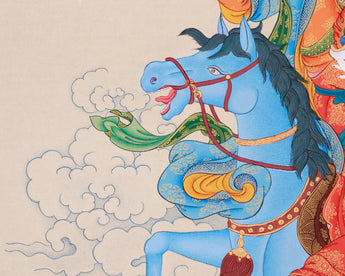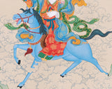 In this thangka, Achi Chokyi Drolma is vividly depicted, seated on a horse, with a five-jeweled crown symbolizing her spiritual authority. She holds a skull cup containing a Norbu (a precious gem), symbolizing the transformation of obstacles into spiritual treasures. She also carries a choddamaru (ritual drum), signifying wisdom and mastery of spiritual practices. Invite her profound wisdom and protection into your space by bringing this exceptional thangka into your home and experiencing her divine blessings.
