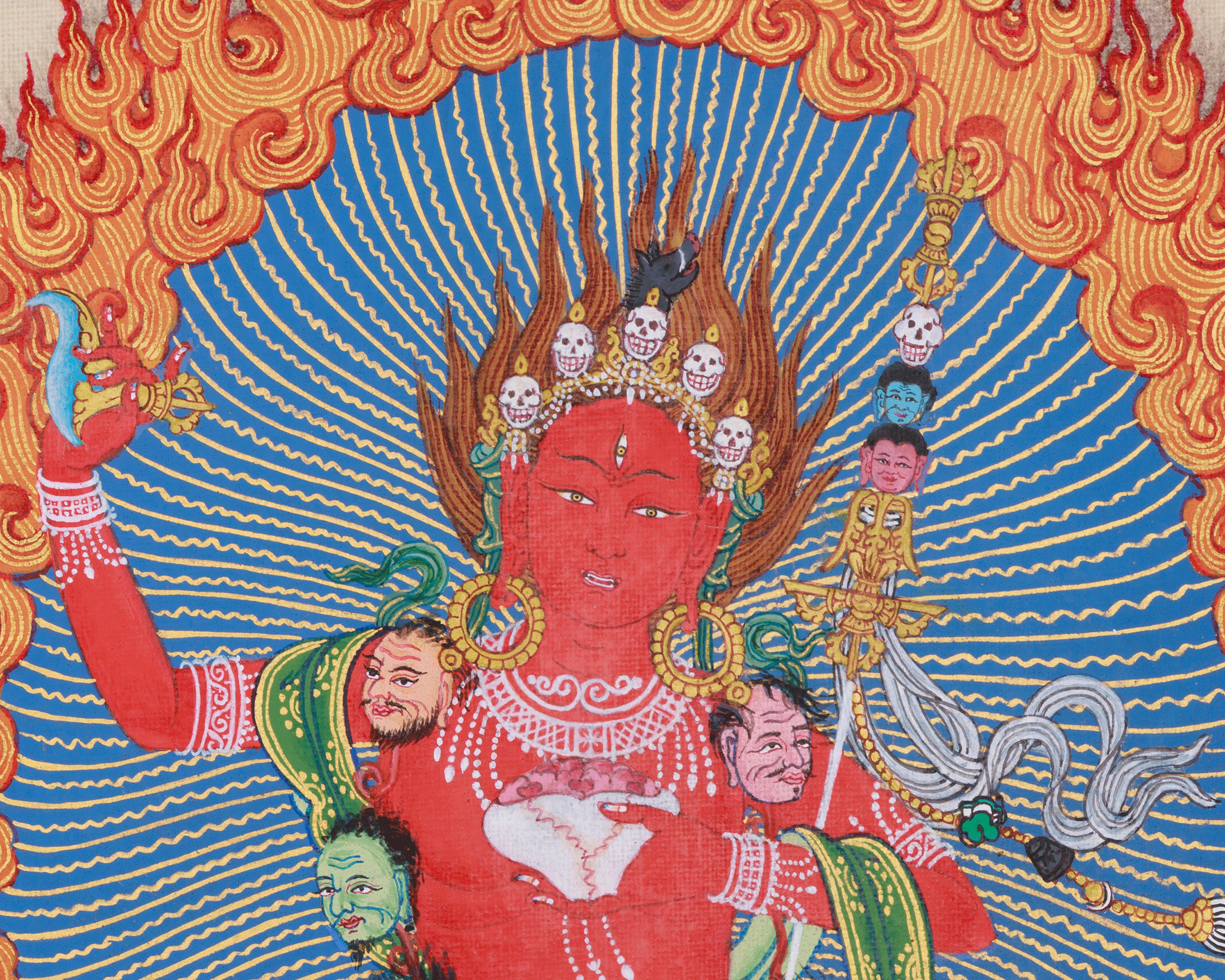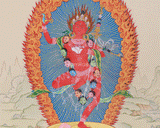 Vajravarahi is depicted in a dynamic dancing posture, symbolizing her active participation in the world to assist beings in overcoming their ego and illusions. She is holding a curved knife in her right hand, signifying her ability to cut through ignorance, and a skull cup in her left, filled with the nectar of compassion. Her crown is decorated with five skulls, symbolizing the transformation of humanity's five poisons into five wisdoms. Vajravarahi, often portrayed as a vengeful yet compassionate figure, is a principal dakini in Vajrayana Buddhism. She is admired as a shining example of wisdom and enlightenment. Her name means "Diamond Sow," referring to her head ornament that shows a sow's head and symbolizes her triumph over ignorance. Vajravarahi is regarded as a manifestation of other female deities, such as Vajrayogini, and is esteemed for her capacity to penetrate spiritual materialism and illusion.