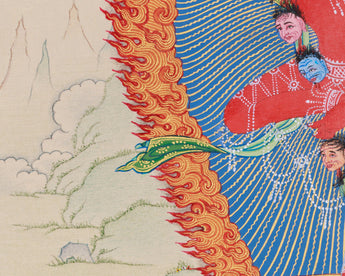 The wrathful Vajravarahi Thangka is esteemed within Tibetan Buddhism for its significance in dispelling spiritual ignorance. It is meticulously hand-painted on cotton canvas, employing natural stone pigments and authentic 24K gold to accentuate her sacred and dynamic qualities. The depiction of Dorje Phagmo in this thangka emanates the intensity and transformative energy she embodies, rendering it an inspiring artifact suitable for any meditation environment or spiritual collection.