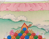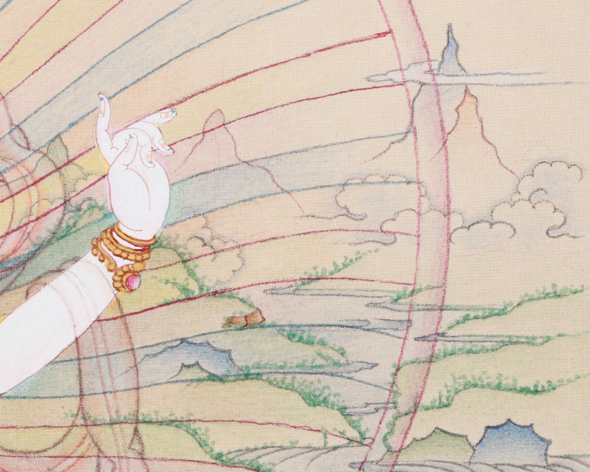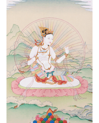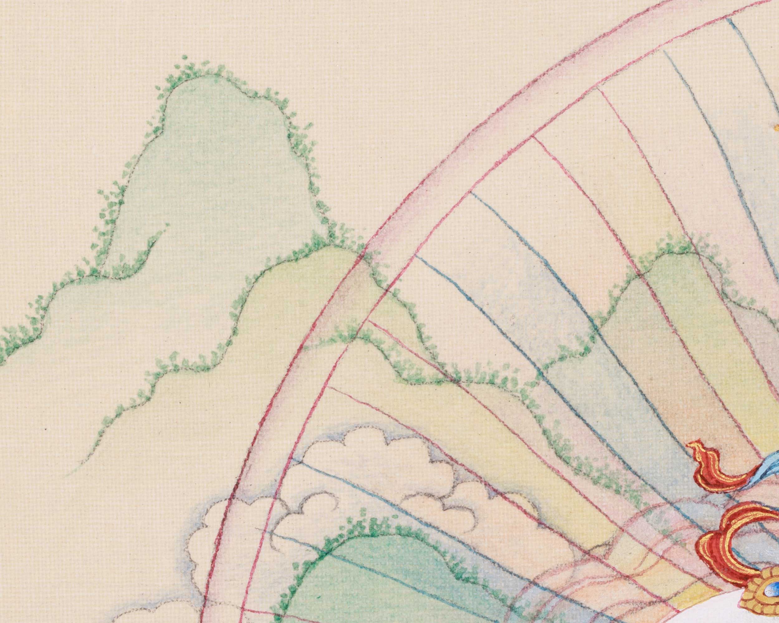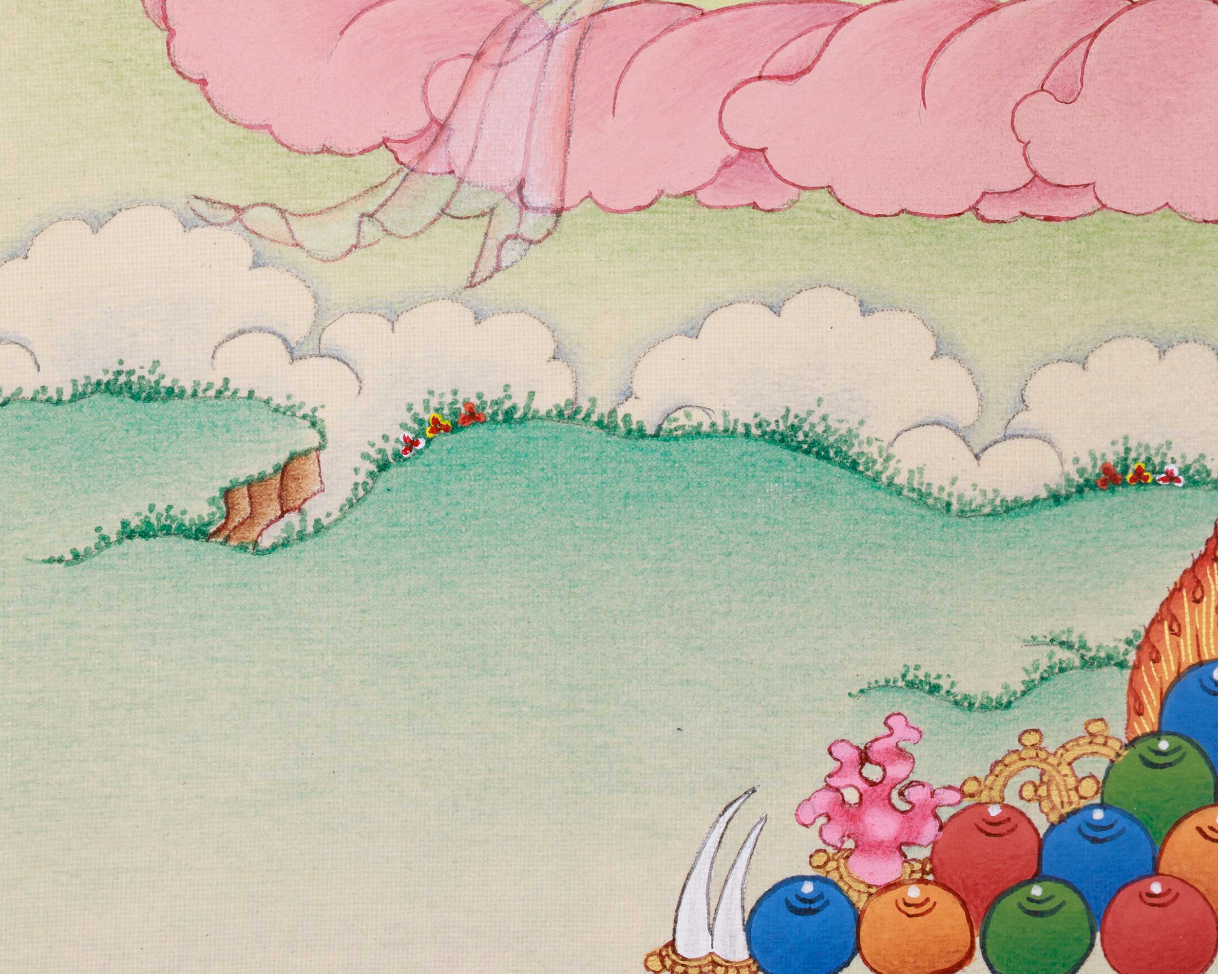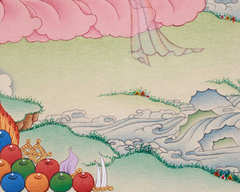 In this thangka, Sukha Siddhi, the esteemed Wisdom Dakini and enlightened female master, is portrayed seated gracefully on a lotus throne, emanating serenity and divine confidence. Her elegant posture reflects spiritual liberation and effortless awareness, while her white form signifies purity and realization. Adorned in rainbow silks and golden ornaments, she embodies enlightened wisdom that transcends duality. Surrounding clouds and mountains enhance her ethereal aura, while pastel shades evoke calmness and meditative stillness. At the bottom, ritual objects represent devotion, abundance, and the continual offering of wisdom to all beings.