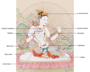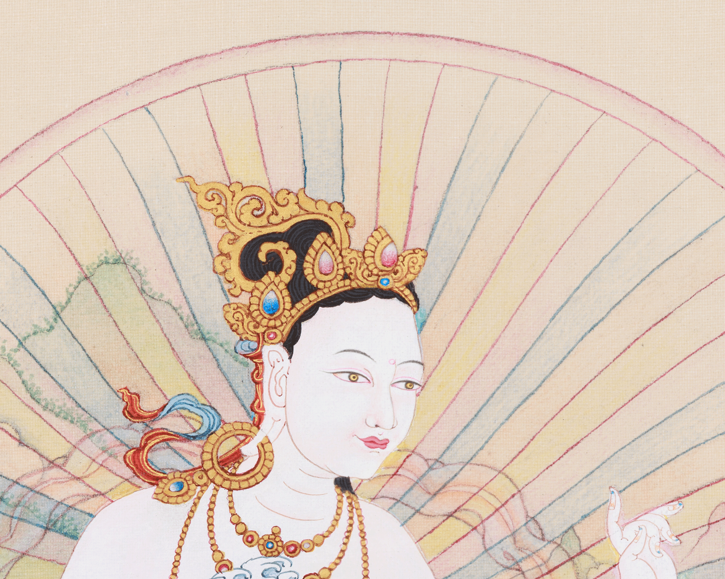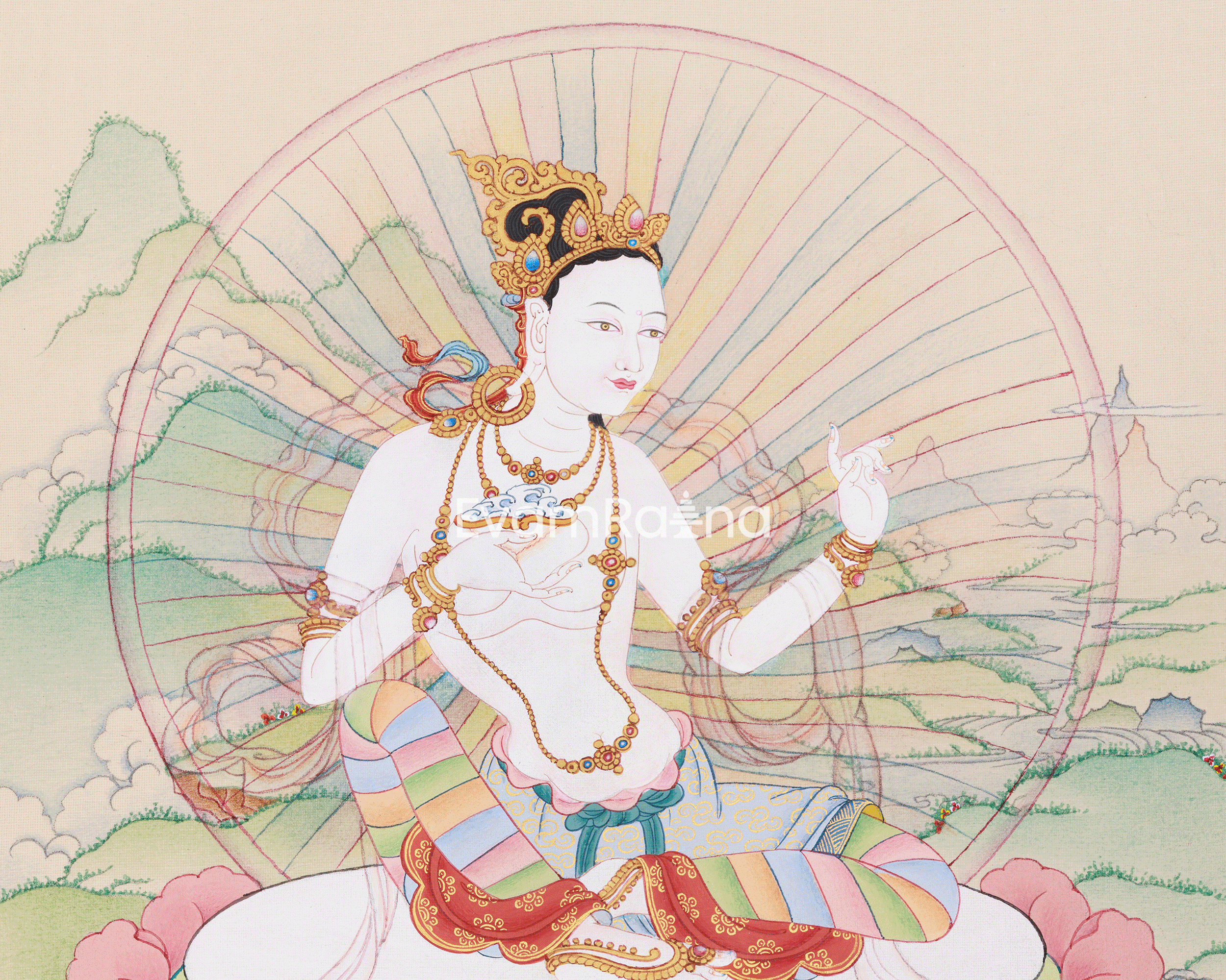 Embody purity, wisdom, and serenity with this Sukha Siddhi Painting—a handmade Nepali thangka on cotton canvas, created with natural stone colors and 24K gold. It radiates spiritual luminosity through mineral pigments that add depth, complemented by gold accents highlighting sacred curves and ornaments, mirroring Sukha Siddhi's divine essence. Following the traditional Karma Gadri style, it harmonizes spiritual symbolism with artistic elegance.