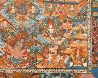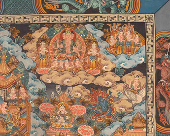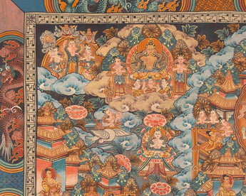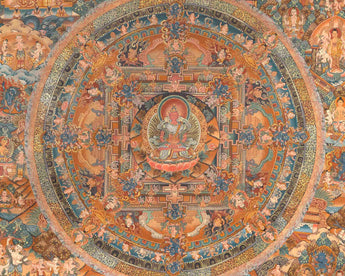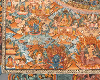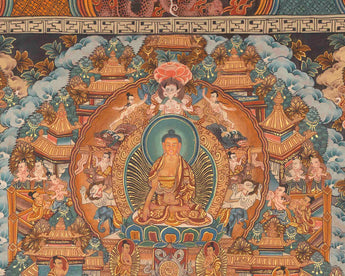The Amitayus Buddha Mandala Thangka is a stunning Tibetan Buddhist art piece depicting Amitayus, the Buddha of Infinite Life and Longevity. The Buddha is depicted in a meditative posture, seated on a lotus throne, radiating serenity and wisdom. He holds a long-life vase filled with immortal nectar, symbolizing life's sustenance and longevity. The mandala is meticulously detailed, serving as a spiritual map to enlightenment. Its geometric precision and symmetrical patterns guide meditation, fostering balance and harmony. The thangka is adorned with rich colors and intricate motifs, including lotus flowers, auspicious symbols, and protective deities. This mandala is a beautiful decorative piece and a powerful tool for meditation and spiritual practice, inviting viewers to connect with the energies of health, longevity, and spiritual awakening.