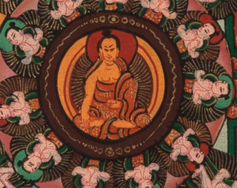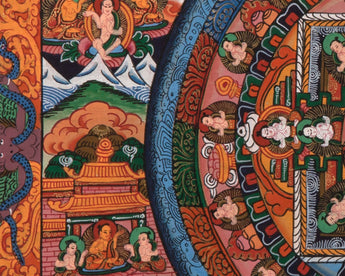 In the painting, there are many smaller circles inside a big circle. In the radial lines of the circle, we can see tiny pictures of Buddha. Above all, the painting tries to reveal the Buddha in different forms.