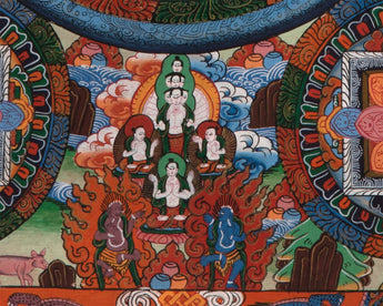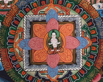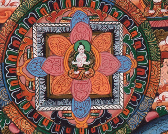 There are many types and varieties of Mandalas depending on the nature of the central deity. The most classic pattern of Mandalas is of the Dhyani Buddha. This Thangka depicts Buddha Mandala. The Mandala represents “palace of purity” a magic sphere cleared of spiritual obstacles and unpurified. The square of the “Sacred palace” proper is end used in multiple circles of flame, Vajra, eight centuries (appears only in wrathful deities) lotus, then the inner square to reach to the deity of the Mandala.