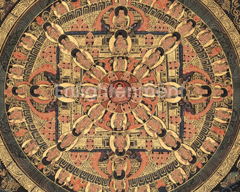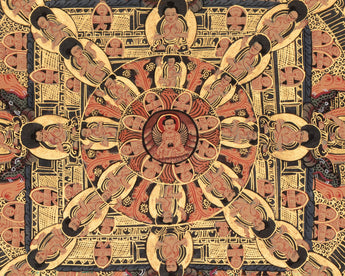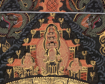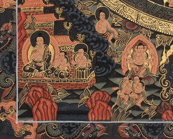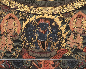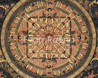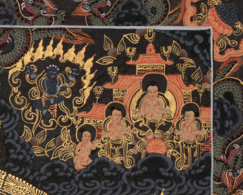 A calm and well-balanced setting for spiritual thought is produced by the striking contrast between the bright gold and the dark background. Intricate designs and representations of multiple deities, including furious guardians, surround the mandala, highlighting the cosmic harmony between strength and compassion. These furious deities surround the serene Buddha in the center, representing the destructive power required to eradicate ignorance and impediments to enlightenment. Reflecting the cyclical aspect of life and rebirth as well as the movement of cosmic energy, the clouds, flames, and other natural components all contribute to the piece's dynamic. This piece of art offers insight into the nature of reality, the cycle of life, and the possibility of freedom. It is also a compelling emblem of Buddhist teachings and a useful aid for meditation.