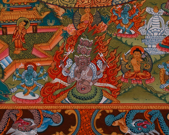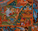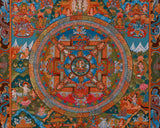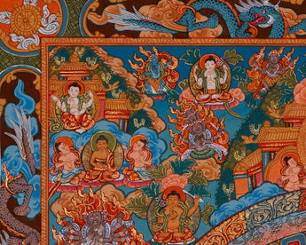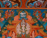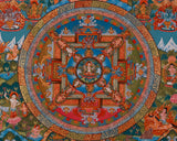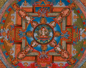 Surrounding him are various deities and figures, each representing different aspects of the Buddhist path, from wisdom and protection to liberation from the cycles of suffering. The mandala’s design symbolizes the interconnectedness of all life and the journey toward enlightenment, with each element thoughtfully placed to convey a deeper understanding of compassion and spiritual wisdom. The outer layers of the mandala are filled with vibrant figures and deities, illustrating the strength and determination required to overcome obstacles on the spiritual journey.