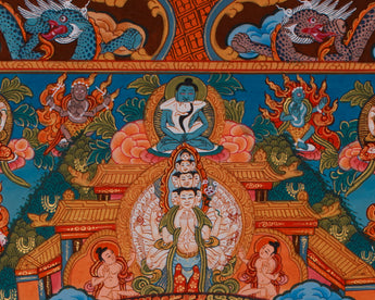 This thangka goes beyond mere artistry; it serves as a profound spiritual tool for meditation, bringing tranquility and healing into its surroundings. Whether used for altar decoration, meditation practices, or as a revered addition to your sacred place, the Chenrezig Mandala consistently embodies compassion and the journey toward enlightenment.