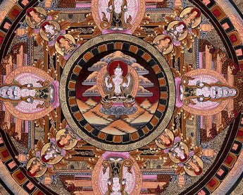Chenrezig is frequently pictured as having a serene look and wearing an Amitabha Buddha statue as part of his crown. The mandala that surrounds it is a sacred geometric design that symbolizes the enlightened cosmos. It often includes numerous Buddhist symbols and deities, complex decorations, and brilliant colors.