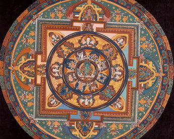 The Mandala represents a symbolic Geometric Diagram in Tantric Buddhism, which visualizes the metaphysical interconnection between microcosm and the universe. Mandalas embody a vast store of Spiritual Energy.