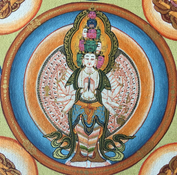 It is said that Bodhisattva Avalokiteshvara made strong vows in front of Buddha Amitabha to intentionally manifest into the three realms of the world to liberate all sentient beings from their sufferings. He also vowed that if by chance his compassion and courageous mind of mercy for all sentient beings were to decrease, then let his head and body just completely crack and fall into thousand pieces.