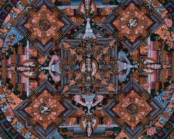 In this particular thangka, there are also four smaller mandalas in the corners, which often represent different aspects of the teachings or additional deities that complement the central figure. These smaller mandalas can provide additional layers of meaning and serve as focal points for meditation, enhancing the overall spiritual impact of the artwork.