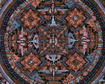 A Buddha Mandala is a symbolic, geometric diagram that represents the universe and various aspects of Buddhist teachings. It serves as a meditation aid, guiding practitioners from the outer physical world to the inner spiritual realm. Mandalas are often used in Tantric Buddhism to visualize the metaphysical interconnections between the microcosm and the macrocosm.