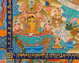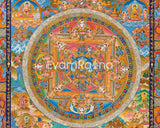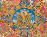Maitreya Buddha is positioned at the center of the mandala, surrounded by celestial beings, sacred designs, and intricate symbolism that signifies the path to enlightenment. The concentric mandala form represents both the aspirant's journey of spiritual development and the universal order of cosmic affairs. Each quadrant, reflecting the spiritual pattern of enlightenment, is harmoniously filled with deities, bodhisattvas, and celestial forms radiating from the center. This mandala is a complex visual text featuring gates, guardians, and celestial attendants that signify karmic purification and stages of consciousness. This Buddha Mandala serves as a focal point of wisdom, tranquility, and future liberation, ideal for meditation, spiritual practice, or display.