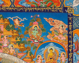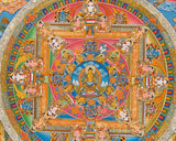 The Maitreya Buddha Mandala offers a visual journey into the celestial realm of the future Buddha, symbolizing loving-kindness and hope for spiritual awakening. This mandala is hand-painted on high-quality cotton canvas, ensuring longevity and a classic texture that beautifully captures sacred variations. The artist used vibrant acrylics to bring celestial details to life, capturing the thangka tradition's palette. Genuine 24K gold is utilized to accentuate details and intricate embellishments, enhancing both luxurious visual depth and spiritual brilliance. This thangka, prepared by a highly skilled Nepali artist with traditional training, is a piece of sacred art of the highest quality and spiritual significance.