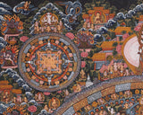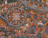 This stunning Mandala artwork of Buddha is a traditional Tibetan Buddhist thangka illustrating the sacred universe. A talented artist hand-painted this mandala following traditional Tibetan sacred art practices. The base is prepared from high-quality cotton canvas, providing a durable and smooth surface ideal for illustrating intricate spiritual geometry. Rich layers of acrylic colors are skillfully applied to deepen the mandala's striking contrasts and symbolic motifs. Genuine 24K gold is used to adorn divine figures and ornamental patterns, creating a dazzling contrast that enhances the piece's spiritual brilliance and richness.