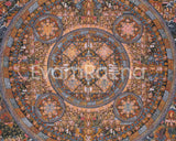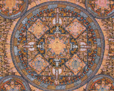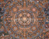 At its core, an enlightened Buddha embodies the peak of spiritual awareness and compassion. The mandala's concentric circles represent stages of meditation and spiritual growth, helping practitioners move away from worldly distractions and toward enlightenment. The outer sections of the mandala are densely filled with deities, bodhisattvas, guardians, instructors, and wrathful protectors, each playing a specific role in Tibetan Buddhist cosmology. The flames, lotus petals, and geometric patterns symbolize purification, spiritual rebirth, and order, respectively. This artwork is ideal for meditation rooms, altars, or sacred spaces, helping you connect with eternal wisdom and the path to liberation.