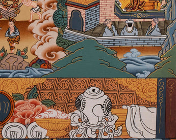 Shakyamuni Buddha is depicted in this amazing thangka art together with the two main disciples as it appears in the most classical representations. This representation of Buddha is a masterpiece from our original thangka painting collection.