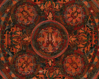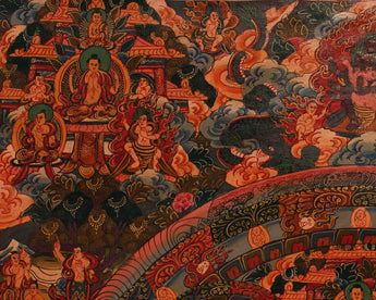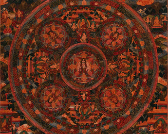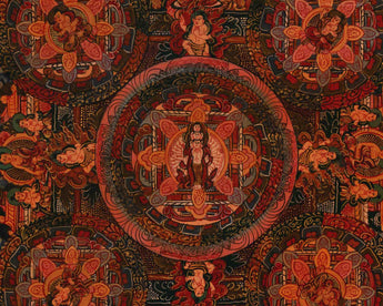 This dazzling portrayal of the oil-varnished Lokeshvara Mandala combines ageless spirituality with creative excellence. Lokeshvara, the embodiment of compassion, sits at the center of the mandala, which conveys a peaceful but strong presence. Lokeshvara is surrounded by elaborate patterns and motifs that have been skillfully painted with oil varnish to enhance their richness and depth. Every aspect of the mandala, from the delicate lotus petals to the vivid colors of heavenly creatures, represents the interdependence of all beings and the Bodhisattva's unbounded compassion. As light dances across the varnished surface, the mandala appears to come to life, enabling viewers to immerse themselves in its transcendent beauty and reflect on the universal truths it embodies.