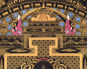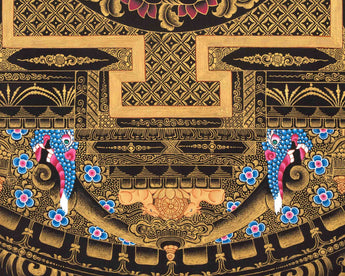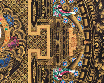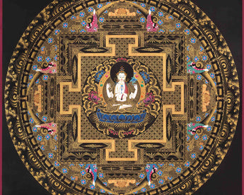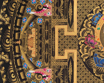 A Chenrezig Mandala is a sacred artistic depiction within Tibetan Buddhism that revolves around the Bodhisattva Chenrezig (Avalokiteshvara). This intricate visual representation places Chenrezig at the center, encircled by an elaborate arrangement of symbols, and geometric patterns. This mandala serves as a focal point for meditation, devotion, and spiritual contemplation, channeling the compassionate and healing energies that Chenrezig embodies. The mandala's design symbolizes the interconnectedness of compassion and wisdom, inspiring practitioners to develop these qualities in their own lives.