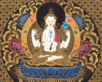 Chenrezig, also called Avalokiteshvara, is a revered Bodhisattva in Tibetan Buddhism, embodying boundless compassion. Often shown with multiple arms and eyes, symbolizing his ability to aid countless beings, he's known as the "Bodhisattva of Compassion." His mantra, "Om Mani Padme Hum," is well-known and invokes his compassionate qualities. Chenrezig's imagery teaches the importance of cultivating compassion and is central to Tibetan Buddhist practices.