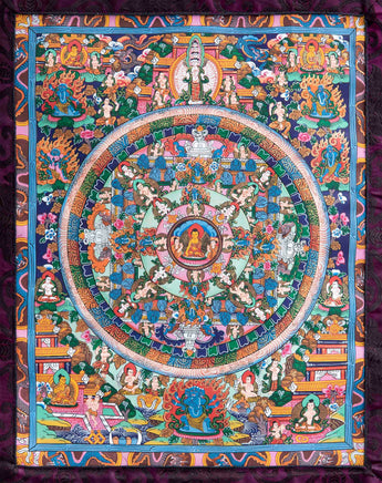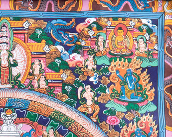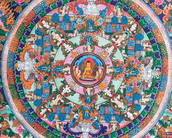 Featuring our exquisite Shakyamuni Buddha Mandala Thangka, adorned with Avalokiteshvara on top and elegantly brocade-framed in Blue. This colorful mandala, which has its roots in Tibetan culture, is more than just wall decor—it represents Buddhist spirituality. The Buddha mandala, a symbolic representation of the universe, holds profound significance, serving as a meditative gateway to enlightenment. The intricate details and sacred symbolism not only enhance your surroundings but also serve as a meditative focal point. Embrace the meditative power of the mandala, using it as a tool for contemplation and spiritual connection.