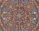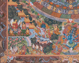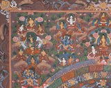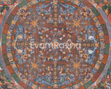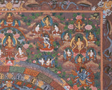 Shakyamuni Buddha, the historical Buddha, is depicted sitting in peaceful meditation on a lotus seat at the center of the mandala. Surrounding him are symmetrical layers of lotus petals, palace architecture, and divine protectors, each symbolizing a stage of spiritual growth. The outer borders illustrate narrative sequences from Shakyamuni's life, including his birth, enlightenment, teachings, and parinirvana, vividly bringing his journey to life for viewers. Fierce guardians at the bottom defend against internal obstacles, while celestial beings at the top symbolize the highest level of liberty. This Thangka serves as both a meditation aid and a devotional object, enhancing awareness, spiritual focus, and sacred vision.