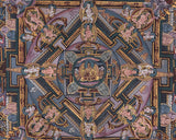 At its core is a mandala palace, an architectural depiction of the heavenly realm, encircled by concentric rings of symbolic guardians, gates, and spiritual symbols. These layers represent different levels of transcendence, from the outer world of illusion to the peaceful core of enlightened awareness. The central Buddha symbolizes an awakened mind, wisdom, and compassion, with the symmetrical design radiating from him. The mandala's outer rings feature scenes from the Buddha's life, protectors, and various spiritual beings that serve as guides and guardians. Such mandalas are used in advanced tantric practices where the practitioner visualizes entering the sacred space, uniting with the deity, and ultimately discovering the non-dual nature of reality.