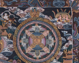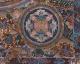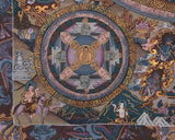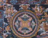 The Tibetan Buddha Mandala Artwork, a sacred symbol of the cosmos, is created to guide practitioners on the path to inner awakening and non-dual realization. A skilled artist hand-painted this mandala according to traditional Tibetan sacred art traditions. The base is made of high-quality cotton canvas, providing a durable and smooth surface ideal for illustrating intricate spiritual geometry. Rich layers of acrylic colors are skillfully applied to enhance the depth and richness of the mandala's striking contrasts and symbolic motifs. Genuine 24K gold is used to adorn divine figures and ornamental patterns, creating a dazzling contrast that adds spiritual brilliance and richness to the entire piece.