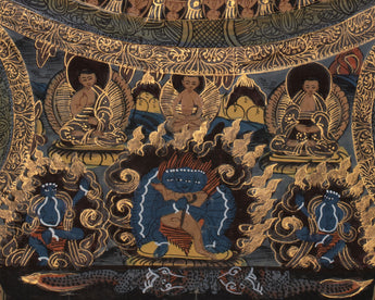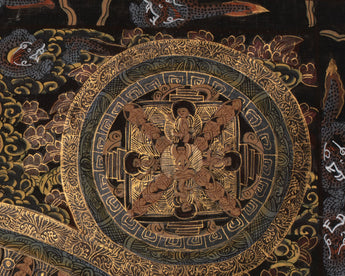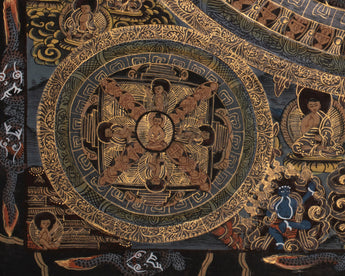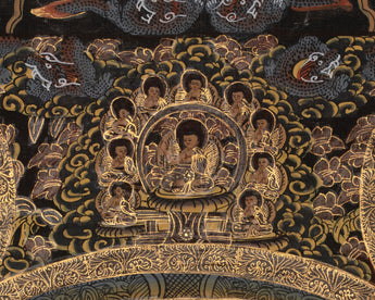 The mandala, painted in striking black and vibrant gold, depicts a Buddha sitting prominently surrounded by layered palaces, symbolic gateways, and celestial architecture. This composition illustrates the stages of the mind's journey from illusion to enlightenment, based on Vajrayana Buddhist cosmology. Every concentric ring symbolizes increasing spiritual progress, while the central Buddha radiates calm and enlightenment, making this thangka an ideal addition to altars, personal sanctuaries, or meditation spaces. The outer border, filled with mythological beings, flames, and celestial clouds, amplifies the spiritual ambiance, making the mandala a living cosmos.