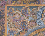 Enter a world of contemplative serenity with this traditional painted grey-colored Buddha mandala, a hand-painted thangka that embodies the spiritual essence of the Buddha's wisdom and inner peace. A talented artist carefully hand-painted this mandala following traditional Tibetan sacred art practices. The base is created from high-quality cotton canvas, providing a durable and smooth surface ideal for illustrating intricate spiritual geometry. Rich layers of acrylic colors are skillfully applied to enhance the depth and richness of the mandala's striking contrasts and symbolic motifs. Genuine 24K gold is used to adorn sacred images, ornamental patterns, and sacred geometry, creating a dazzling contrast that adds spiritual brilliance and richness to the entire piece.