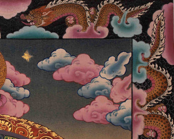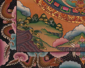 Embracing the sacred imagery is a vibrant border adorned with thick, intricately detailed dragons, each scale a testament to ancient craftsmanship and reverence for the spiritual realm.