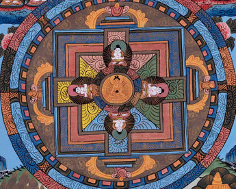 The Mandala's center is embellished with Lord Buddha and his followers meditating. One of its purposes is to become aware of the physical body's fundamentally spiritual or unconscious essence, which Tantrikas regard as a concentrated form of divine light or a divine vibration of sound.