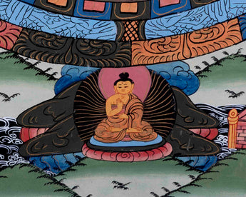 This Buddha Mandala Thangka depicts a symbolic representation of the world and a mechanism (Yantra) for practicing Tantric Buddhism. Tantric Buddhism is a Buddhist tradition that emphasizes mystical rituals and notions as a means of attaining enlightenment. This thangka is made up of several pieces of artwork such as deities, symbols, prayers, and geometric ornamentation.
