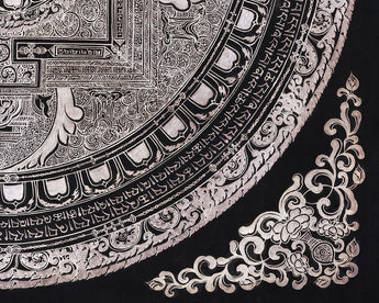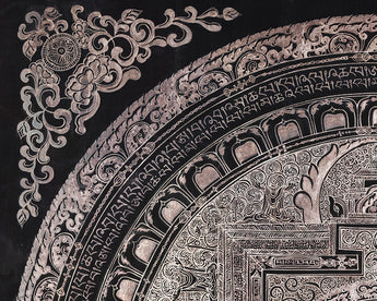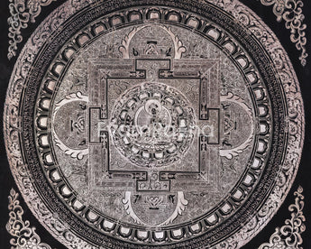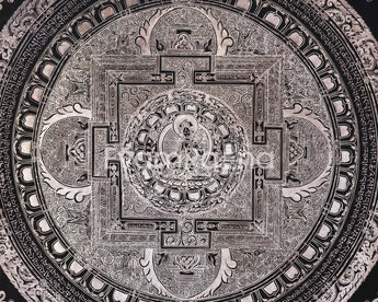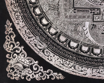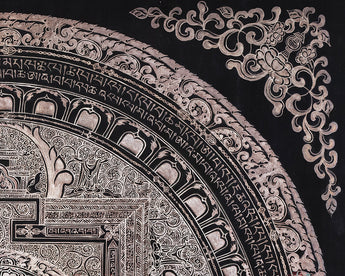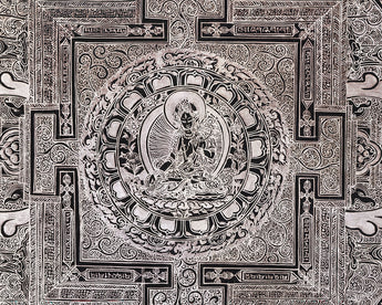 White Tara is depicted sitting elegantly in the middle of the mandala, with seven eyes on her face, palms, soles, and forehead, signifying her all-seeing consciousness and her capacity to sense the pain of sentient beings in all realms. The intricate design of the mandala acts as a spiritual journey that guides practitioners inward, fostering inner harmony and enlightenment. The mandala's vibrational and spiritual force is enhanced by the addition of mantras in Tibetan script that surround it. Simultaneously, the geometric layers of concentric circles and sacred squares establish protective barriers that create a sacred space for meditation. Whether for meditation, or an altar, or as sacred art, this mandala embodies compassion, longevity, and spiritual insight.