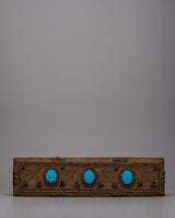 Immerse yourself in the ancient tradition with our Tibetan Prayer Book skillfully handcrafted on a copper body and embellished with exquisite silver plating. This gorgeous prayer book is a stunning combination of spiritual workmanship and artistic beauty, with expertly inlaid turquoise, lapis lazuli, coral, panna, and ruby stones.
