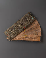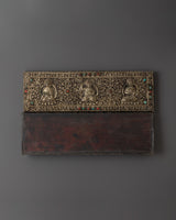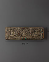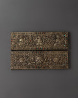 This Silver Plated Ritual Book is a masterfully handcrafted artifact, measuring 12.5cm in height and 37.5cm in width, with a total weight of 1.53kg. Crafted from a copper body with silver plating, it is adorned with coral inlay and intricate carvings of Vairochana, Ratnasambhava, and Manjushri. Symbolizing sacred Buddhist scriptures, this ritual book represents the timeless wisdom of the Dharma and serves as a powerful centerpiece for shrines, meditation rooms, and ceremonial practices.