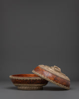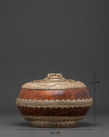 Experience the elegance and spiritual significance of the Authentic Buddhist Wood Rice Pot, a wonderfully created object that combines cultural history with skillful craftsmanship. Made of wood, it has elaborate workmanship and silver-plated accents, exemplifying the best Tibetan artistry. Its elegant design preserves the essence of Buddhist tradition, acting as both a utilitarian container and an ornamental treasure.
