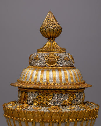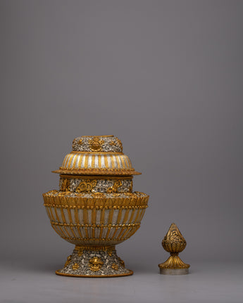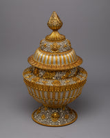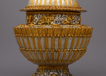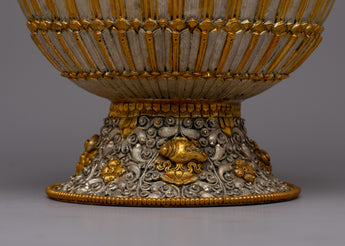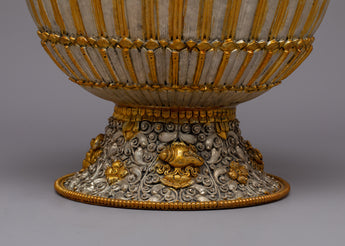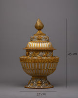 With our elegant Tibetan Rice Pot, you can add a sense of luxury and custom to your room. Expertly created by hand from copper, this pot has a stunning and opulent appearance thanks to the addition of electro-gold and silver plating. With its remarkable dimensions of 45 cm in height and 27 cm in breadth, this rice pot is sure to make a statement in any arrangement.