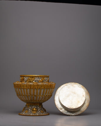This pot, weighing 4.33 kg, demonstrates significant quality and longevity. It represents rich cultural tradition and craftsmanship and is more than just a beautiful piece. This Tibetan Rice Pot is ideal for adding a touch of beauty and spirituality to your home decor or using it as a practical item in rituals. Seize the chance to possess this exquisite fusion of luxury and history, an exceptional work of art that enhances any collection.