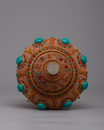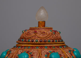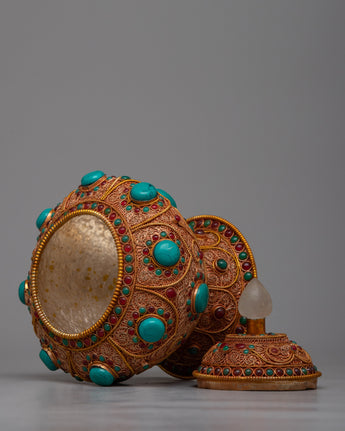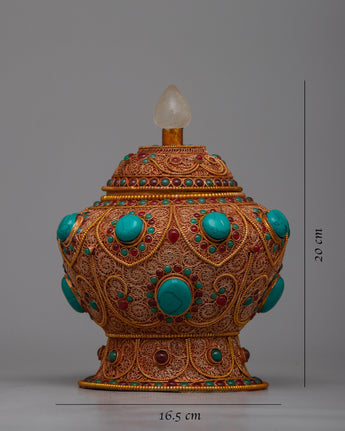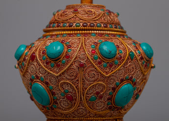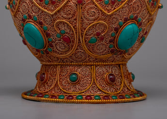 Its surface is embellished with beautiful filigree work, which demonstrates the artisan's talent and perfection. The jar also incorporates expensive coral, turquoise, ruby, and panna stones, which provide color and symbolic meaning to its design. Whether used to store spices or as a decorative addition, the Tibetan Crock Jar is a mesmerizing icon of Tibetan culture and history, urging devotees to appreciate its beauty and craftsmanship.