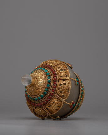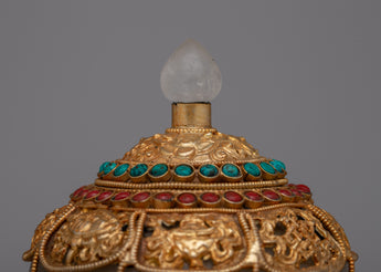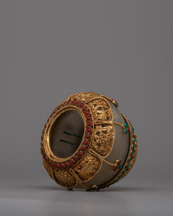 The exquisitely crafted Crystal Rice Pot is a work of beautiful art, with a robust copper body and fine craftsmanship. The electrogold plating on this gorgeous pot creates a shimmering, opulent finish that accentuates its fine craftsmanship. Turquoise, coral, and crystal stones are expertly inlaid into the pot to produce a breathtaking visual impact. This rice pot is transformed into a striking ornamental piece that is ideal for enhancing the beauty of any room by the mix of the colorful stones and gold plating.