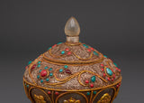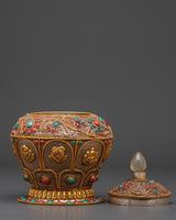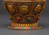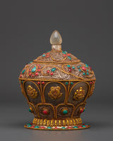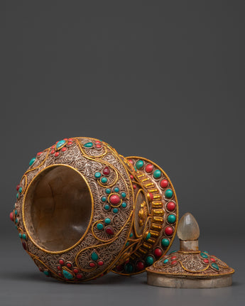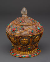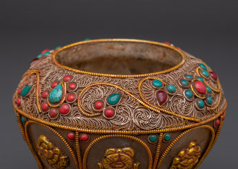 This Decorative Rice Pot will add beauty and tradition to your spiritual ceremonies. This ceremonial rice pot, measuring 17cm in height and 13.5cm in width, is ideal for religious rites that represent abundance and prosperity. Weighing 2.04kg, it has a solid and graceful presence that contributes to the spiritual environment. This pot, crafted from crystal, copper, and gold plating and embellished with turquoise and coral stones, adds a unique blend of luxury and religious meaning to your ritual activities.