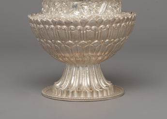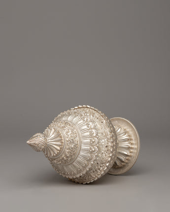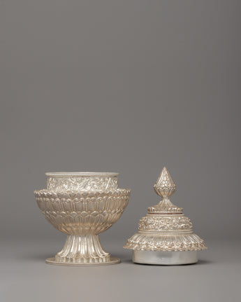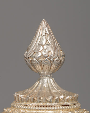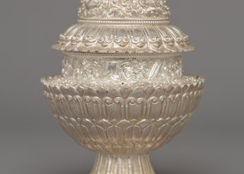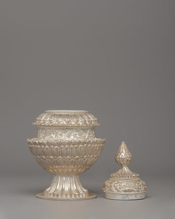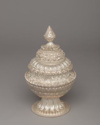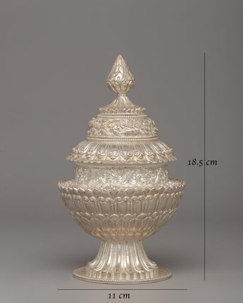 The Dhupur Rice Pot stands 18.5 cm tall and measures 11 cm in width, weighing 0.482 kg. Expertly crafted from pure silver, it features intricate decorations that symbolize superior craftsmanship and spiritual significance. In Buddhist rituals, the Dhupur pot carries offerings representing abundance and the act of giving.