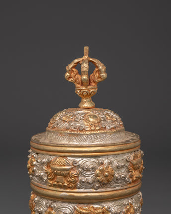 Ethnic Tibetan Rice Pot | Intricate Floral Design with Vajra Lid for Sacred Ceremonies