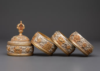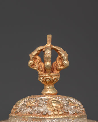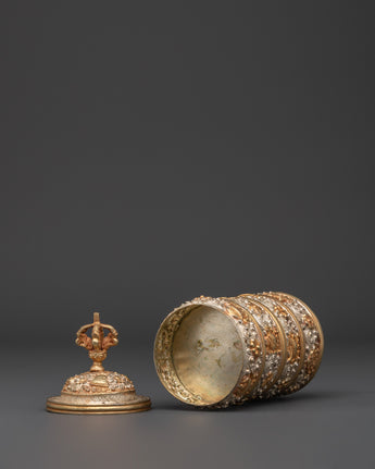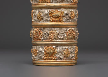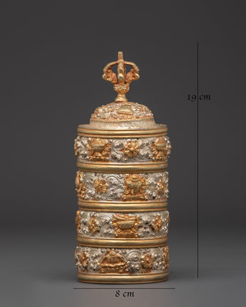 This Ethnic Tibetan Rice Pot is a beautifully crafted decorative piece that represents Tibet's cultural and spiritual heritage. It is 19 cm tall and 8 cm wide, made of copper and highlighted with silver-plated and gold-plated finishes. The floral design carved on the surface symbolizes growth, purity, and harmony with nature. The Vajra lid, which represents power and spiritual strength, lends reverence and significance to the item. Ideal for use in ancient Tibetan rituals or as a beautiful decorative object in your home.