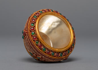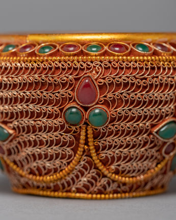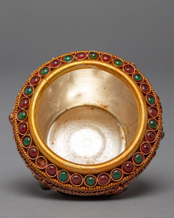 This jar is a stunning example of traditional craftsmanship, handcrafted from copper and lavishly plated in 24k gold. The gemstones carefully embedded in the jar add to its overall beauty and elegance, transforming it into a true work of art. The jar's one-of-a-kind and intricate design demonstrates the skill and creativity of the artisans who created it. This piece is not only beautiful to look at, but it also has significant cultural and spiritual significance in many traditions.