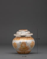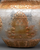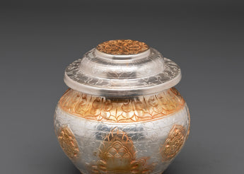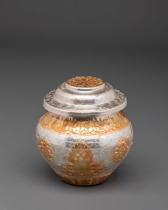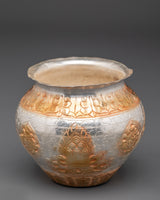 This exquisitely handcrafted Gold and Silver Plated Ritual Rice Pot will elevate your spiritual rituals. This sacred vase, crafted from copper and meticulously polished with bright gold and silver plating, is typically used in Buddhist and Hindu ceremonies to store rice offerings, which symbolize abundance, prosperity, and sacred blessings. With dimensions of 11cm in height and breadth and a weight of 0.86kg (single), it can be used as both a spiritual instrument and a decorative piece for your altar, meditation place, or ceremonial setting.