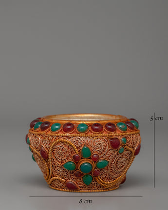 Presenting a stunning gold-plated Tibetan Golpa bowl that has been carefully created by hand, featuring a copper body and embellished with vivid imitation coral and blue stones. In Tibetan Buddhist ceremonies, this offering bowl, with its elaborate gold-plated filigree work, is a revered representation of dedication and wealth. It is frequently utilized as a decorative element on home altars or during offerings and exudes artistic and spiritual value. The striking contrast of coral and turquoise with the gold-plated foundation brings your sacred area into harmony and balance.
