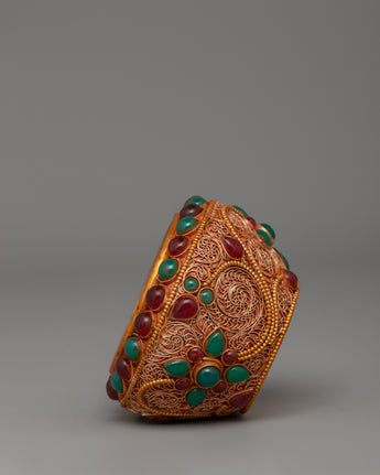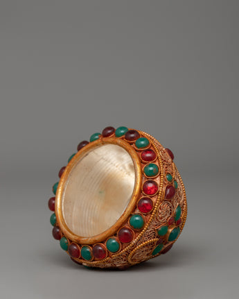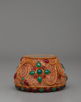 Expertly designed and adorned by talented artisans, each bowl is a masterpiece of Himalayan artistry. The intricate filigree ornamentation reflects ancient methods handed down through the years. The significance of this bowl stems from customary offering rituals in which it stores rice, water, or other holy objects to appease the gods and bring good luck. This Golpa bowl offers beauty, cultural history, and an enhanced spiritual ambiance, regardless of whether you are a spiritual practitioner or a collector of sacred artwork.