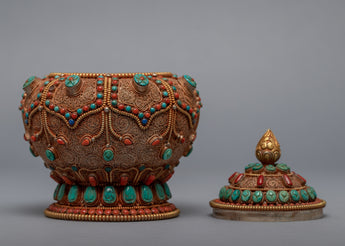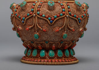 Its surface is embellished with beautiful filigree work, which demonstrates the artisan's talent and perfection. The jar also incorporates expensive coral, turquoise, ruby, and panna stones, which provide color and symbolic meaning to its design. Whether used to store spices or as a decorative addition, the Tibetan Crock Jar is a mesmerizing icon of Tibetan culture and history, urging devotees to appreciate its beauty and craftsmanship.
